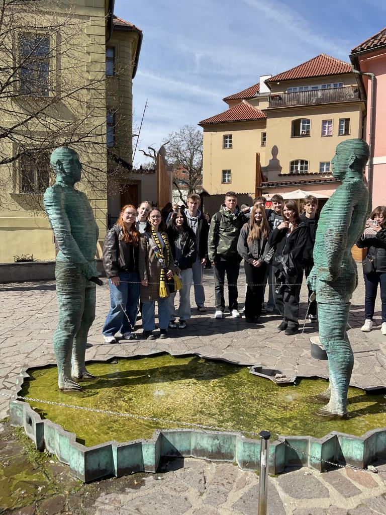 Naše skupina začala prohlídkou venku. Vydali jsme se na krátkou procházku po Praze, konkrétně po Kampě, kde jsme si prohlíželi známé sochařské památky. Viděli jsme například Tučňáky, miminka (tzv. „babies“), Sovovy mlýny, Pocta Věře, Sto třicet sedm, a další zajímavá díla, která běžně možná ani nevnímáme.